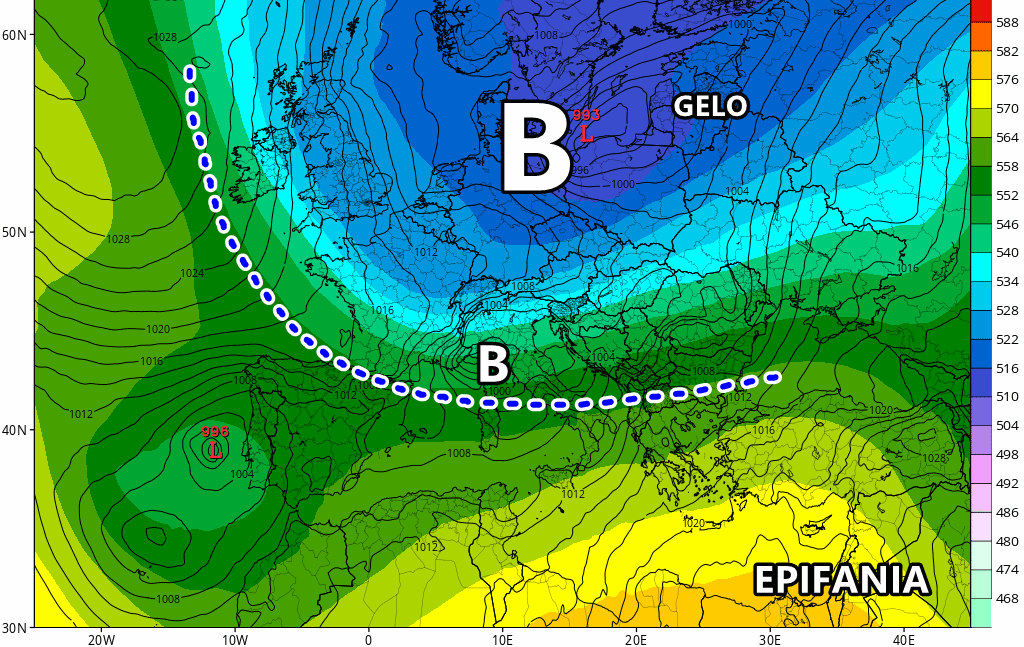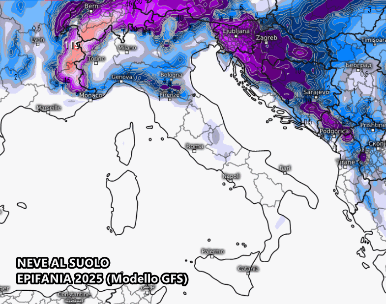 Il modello americano GFS propone uno scenario piuttosto freddo e a tratti nevoso fino a bassa quota per il giorno dell’Epifania. Tuttavia, è importante sottolineare che questa è solo una possibilità al momento e non un’ipotesi particolarmente probabile. Tutto dipenderà dalla tenuta dell’alta pressione delle Azzorre in pieno Atlantico.