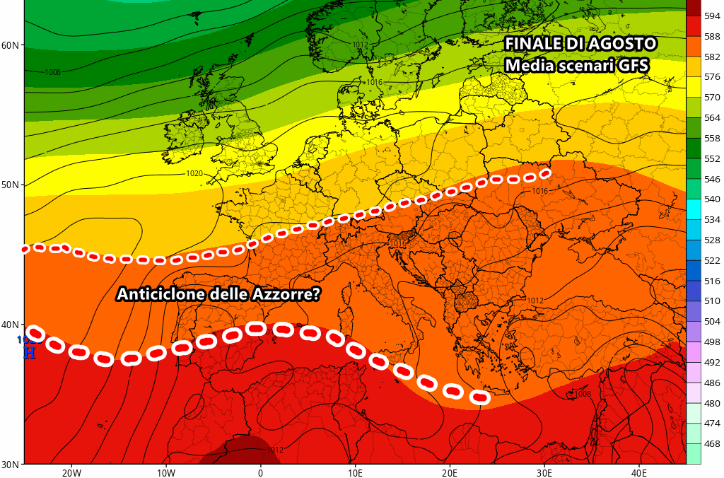 Dal 24 Agosto l’anticiclone tornerà ad espandersi verso il Mediterraneo, ma questa volta potrebbe trattarsi di un più dolce anticiclone delle Azzorre anziché il solito bollente promontorio nordafricano. Le temperature, nell’ultima settimana del mese, sono attese in aumento ma pare che non riusciranno a portarsi sui valori eccessivi registrati durante queste ultime settimane.