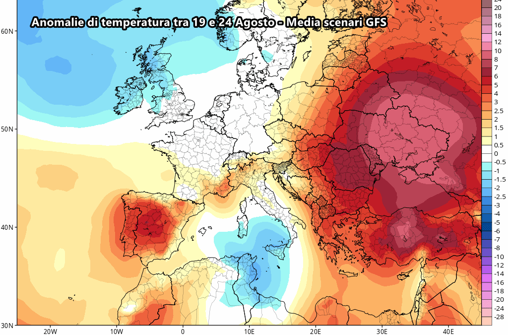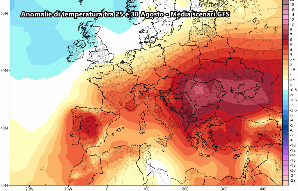 Le anomalie più ragguardevoli, tra 25 e 30 Agosto, sono previste sull’est Europa. In Italia troviamo anomalie di circa+2/+4°C sopra le medie del periodo, decisamente lontane dalle anomalie attuali.