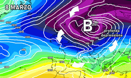 La causa di questi venti di libeccio, che rischiano di farci compagnia per tanti giorni nel corso della prossima settimana, è la discesa di un lobo del vortice polare direttamente sull’Europa centro-settentrionale. Proprio nel cuore dell’Europa si svilupperà una profonda depressione con minimo barico inferiore ai 975hpa, attorno al quale si svilupperanno intensi venti ciclonici. Sul Mediterraneo, dove la pressione sarà nettamente più alta, si attiveranno i venti di libeccio sin da lunedì 6 marzo.