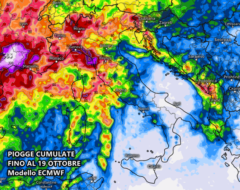 Ancor più estremo il modello europeo ECMWF, il quale nei prossimi 10 giorni sottolinea ancor di più la differenza tra nord e sud Italia. Su Liguria orientale e alta Toscana spuntano accumuli totali di pioggia superiori ai 250-300 mm, valori davvero esorbitanti considerata tutta la pioggia già caduta!