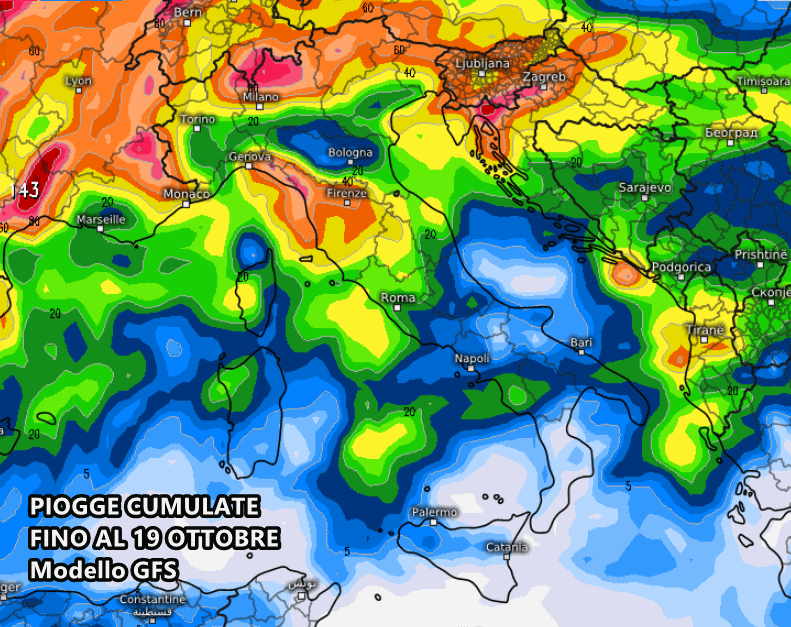 Di seguito possiamo osservare gli accumuli di pioggia totali previsti nei prossimi 10 giorni, fino al 19 Ottobre, dal modello americano GFS. Come sempre troviamo piogge abbondanti su Liguria centro-orientale, Toscana, Appennino emiliano, medio-alta Lombardia e Triveneto, insomma le solite aree duramente colpite dal maltempo negli ultimi mesi: