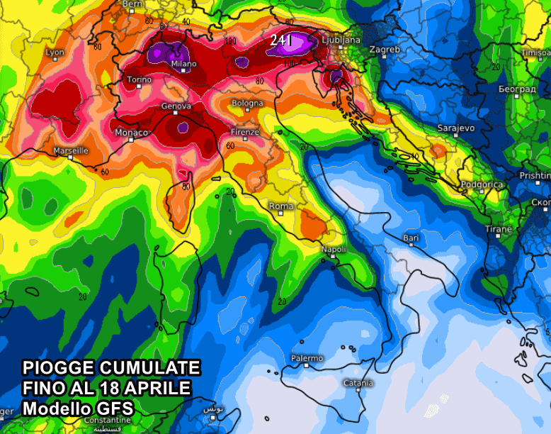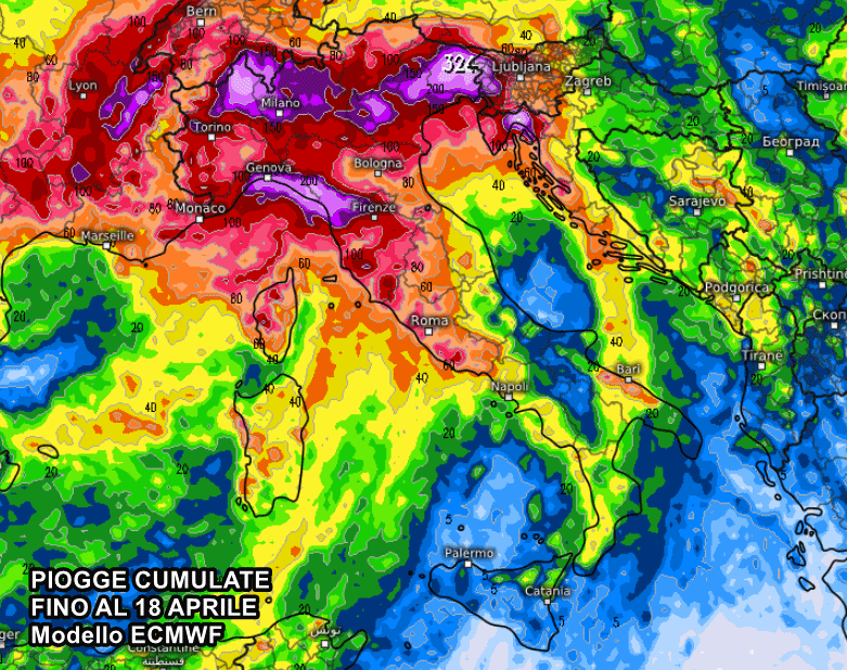 Il modello europeo ECMWF ipotizza quantitativi di pioggia esorbitanti su Alpi e Prealpi, dove potrebbero scendere localmente oltre 300 o 350 mm. Parliamo di numeri davvero clamorosi per il mese di aprile, nonostante ci troviamo in una stagione di transizione e ricca di instabilità. Tutta questa pioggia nell’arco di appena quattro giorni potrebbe risultare deleteria, soprattutto considerando le tante piogge avvenute negli ultimi mesi.