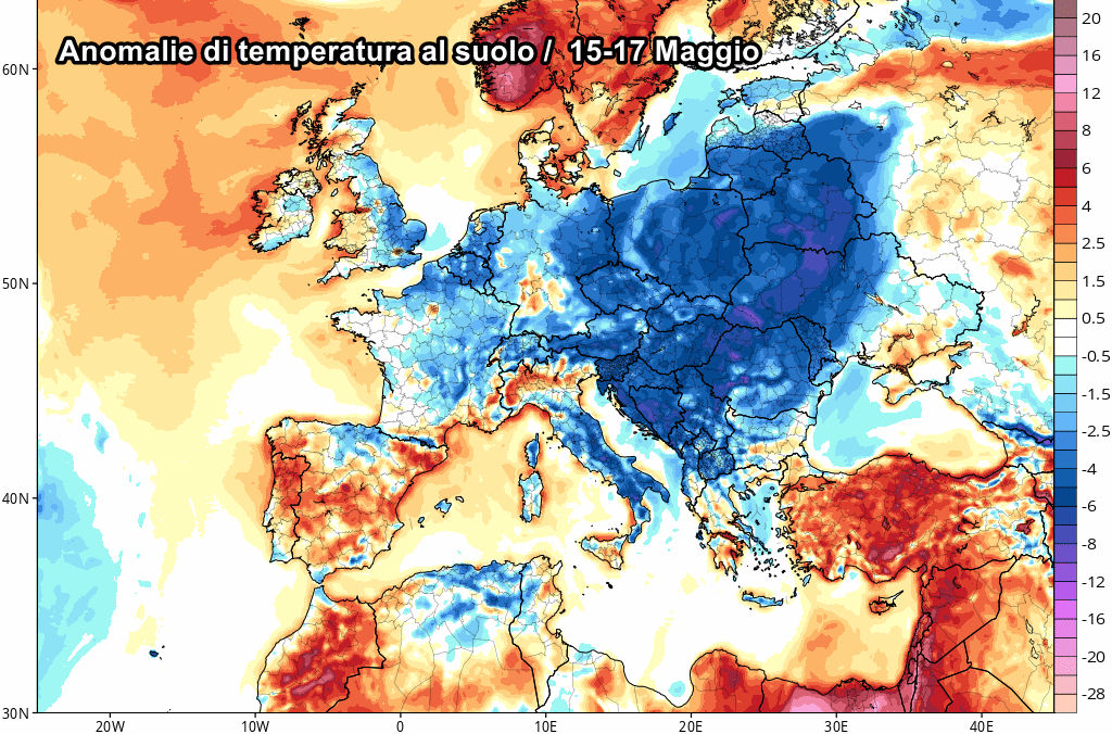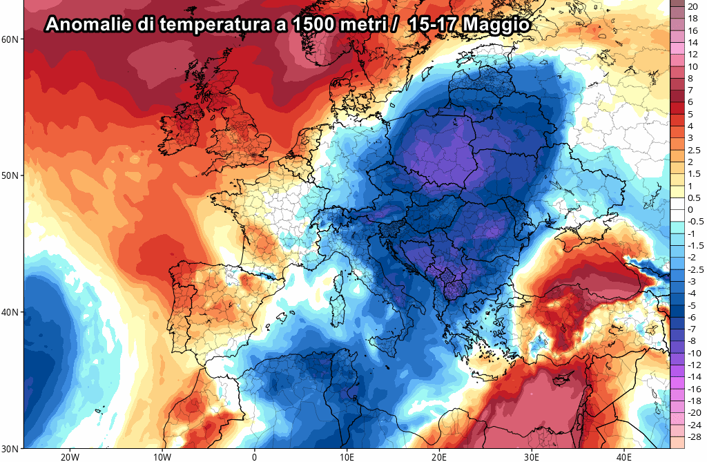 Il picco di questa ondata di freddo sull’Europa è previsto tra 15 e 17 Maggio, con temperature di quasi 11-12°C sotto le medie del periodo!