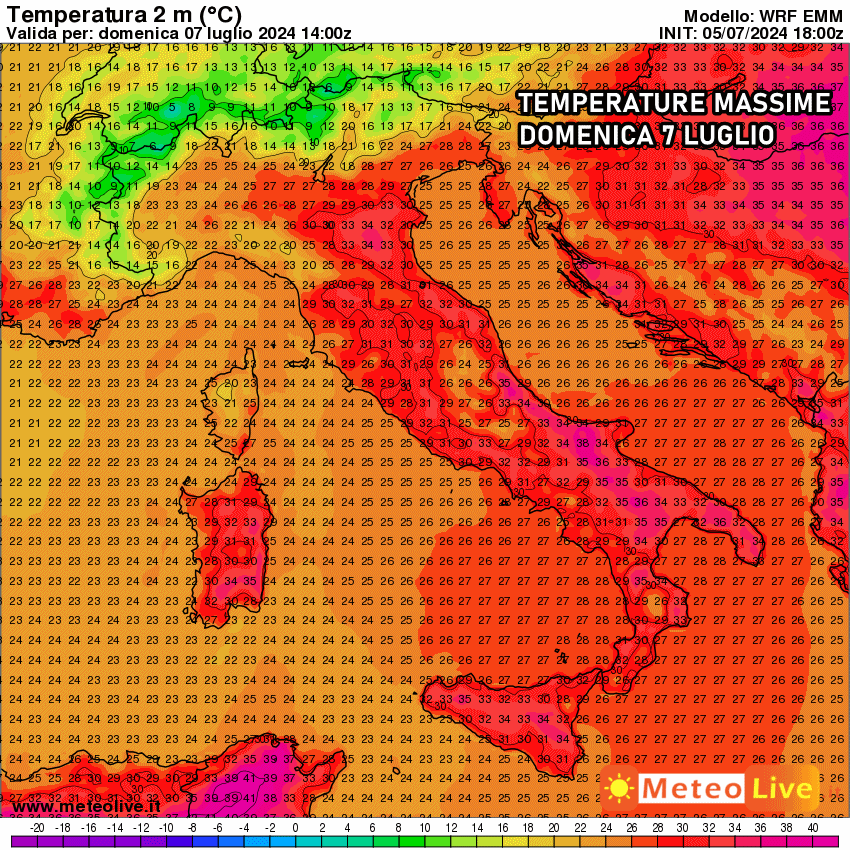 Eloquente è la previsione delle temperature massime per domenica, con punte anche oltre i 35 °C nelle zone interne del Meridione.