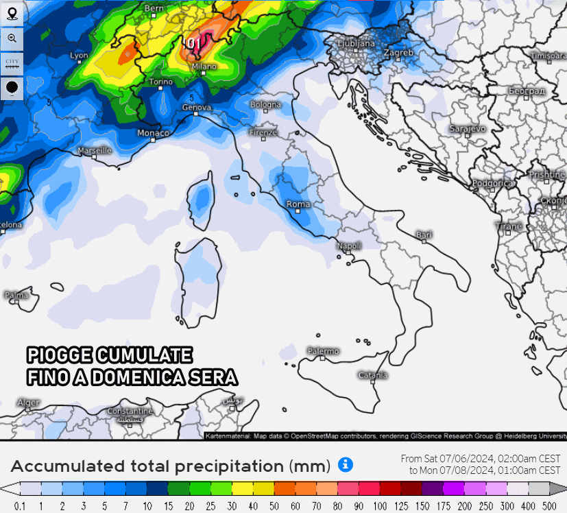 I primi fenomeni colpiranno il Nord-Ovest nel corso della serata odierna, specie su Piemonte, alta Lombardia e bassa Valle d’Aosta. Ci aspettiamo locali fenomeni intensi come grandinate e improvvisi nubifragi che potrebbero dar luogo ad accumuli superiori ai 30-40 mm. La giornata più instabile sarà quella di domani, considerando che gran parte del Nord se la vedrà con piogge e temporali localmente violenti. È bene ricordare che le aree più colpite saranno quelle montuose tra Piemonte e Lombardia, quindi settori alpini e prealpini, dove potrebbero precipitare complessivamente fino a 100 mm di pioggia fino a domenica sera: