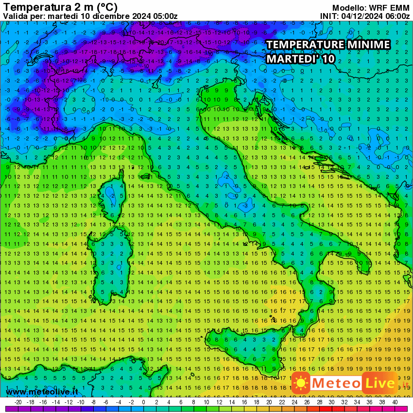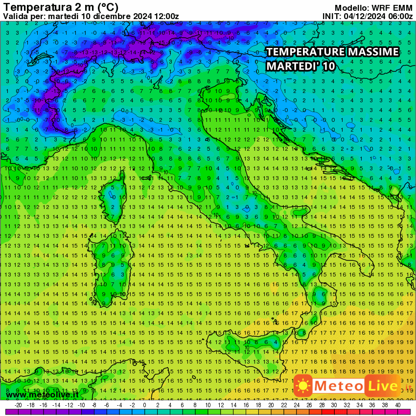 Martedì 10 Dicembre ancor più freddo al nord, con massime anche di appena 5-6°C, mentre al centro Italia le zone costiere toccheranno i 12-13°C. Fino a 14-15°C al sud Italia, su coste e pianure, mentre nelle zone interne e collinari difficilmente andremo oltre i 9-10°C.