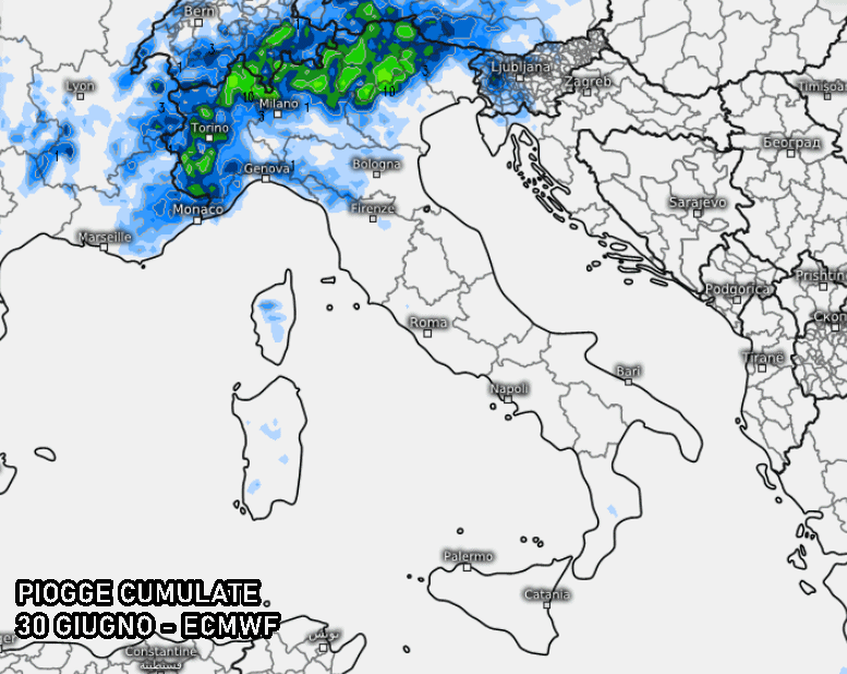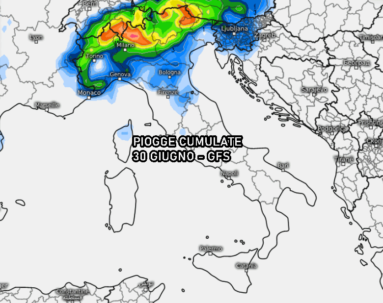 Trattandosi di temporali di calore, è chiaro che parliamo di fenomeni isolati ma potenzialmente di forte entità. Il modello americano GFS mostra un netto guasto nella giornata di lunedì 30 giugno con precipitazioni più presenti su Alpi e Prealpi, ma localmente anche sulla Val padana.