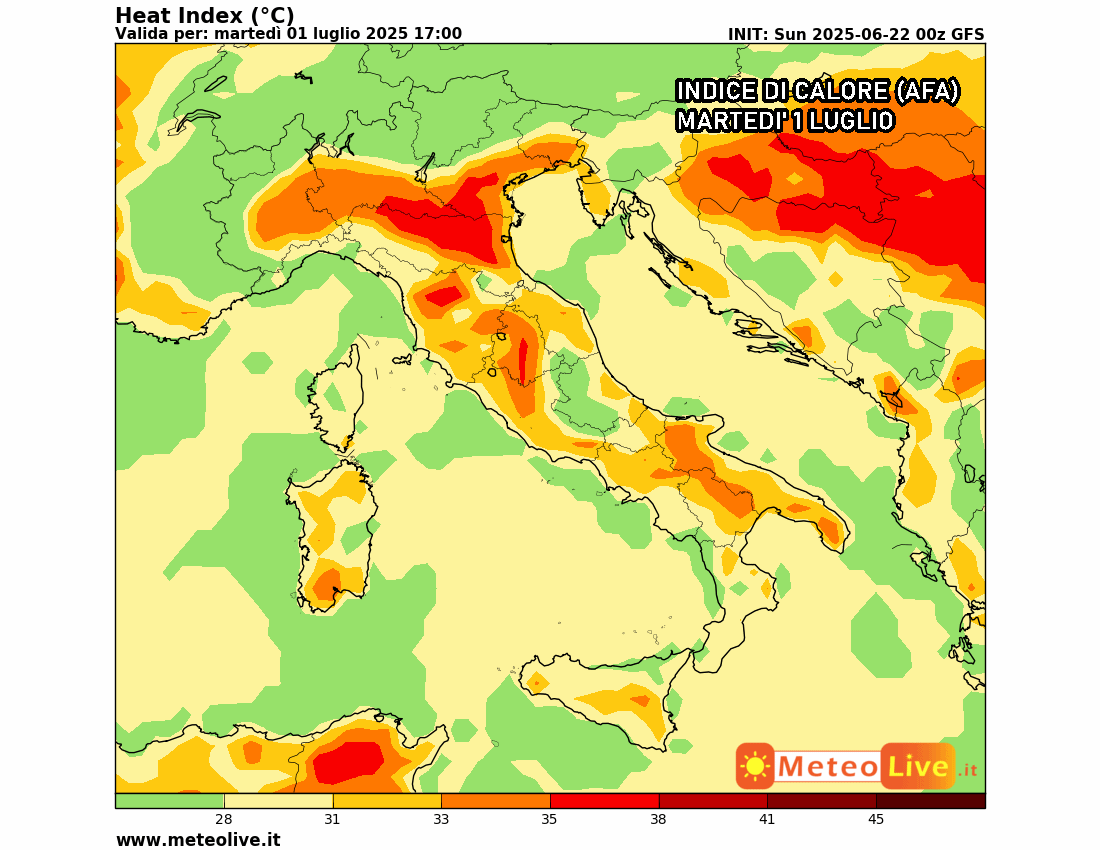 Eloquente l’indice di calore previsto il 1° luglio, su valori medio-alti su gran parte della Val Padana e nelle aree interne del centro-sud, segno della presenza di aria decisamente pesante e caldo insopportabile.