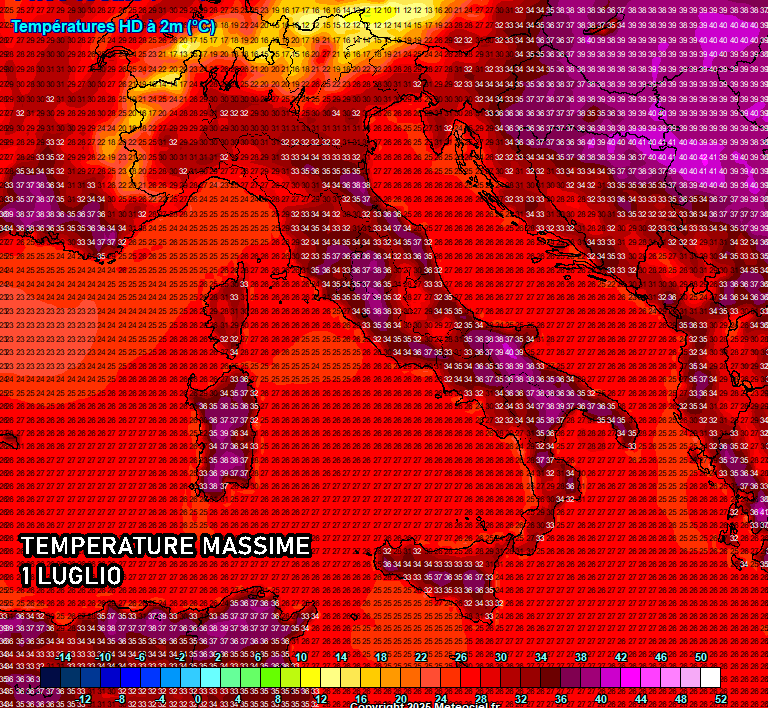 Eloquenti le temperature massime previste il 1° luglio, il secondo mese dell’estate meteorologica, che pare intenzionato ad aprire i battenti con caldo intenso, afoso e fastidioso su tutto il nostro Stivale. Spuntano picchi di 40 ° soprattutto sulla Puglia settentrionale, valori di 38-39 ° nelle aree interne delle isole maggiori e, a sprazzi, anche in Val Padana.