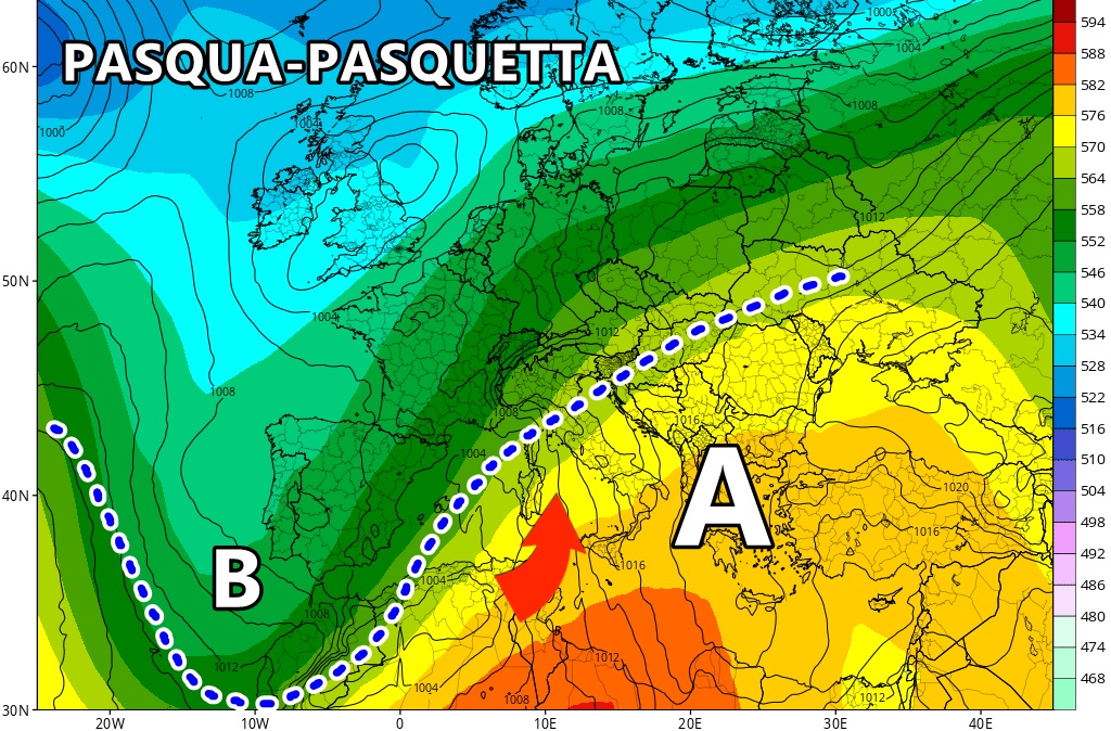 Passata questa fase perturbata piuttosto incisiva, potremmo assistere a un repentino miglioramento e quindi comincerebbe una seconda fase decisamente più stabile per buona parte d’Italia. L’asse di discesa delle Saccature fredde nord-atlantiche potrebbe ruotare e quindi andare a prediligere l’Europa occidentale e l’Africa nord-occidentale. La discesa di queste masse d’aria più instabile e più fredde su settori come Portogallo, Marocco, e Spagna potrebbe innescare la risalita dell’Anticiclone subtropicale sulla nostra penisola, il quale, proprio a ridosso di Pasqua, favorirebbe un repentino miglioramento del tempo e soprattutto un clamoroso aumento delle temperature principalmente al sud e al centro: