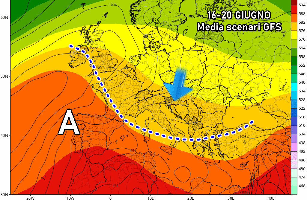 Anche la media degli scenari di GFS, che al momento è la previsione mediamente più probabile a lungo termine, ci mostra un netto cedimento dell’alta pressione subtropicale dopo metà giugno.