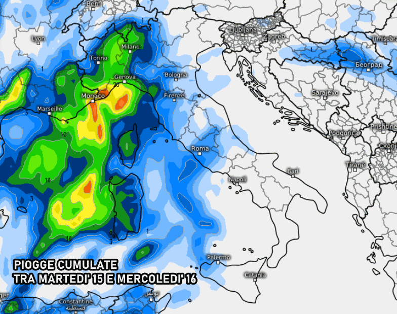 DI seguito le piogge previste tra martedì 15 e mercoledì 16: