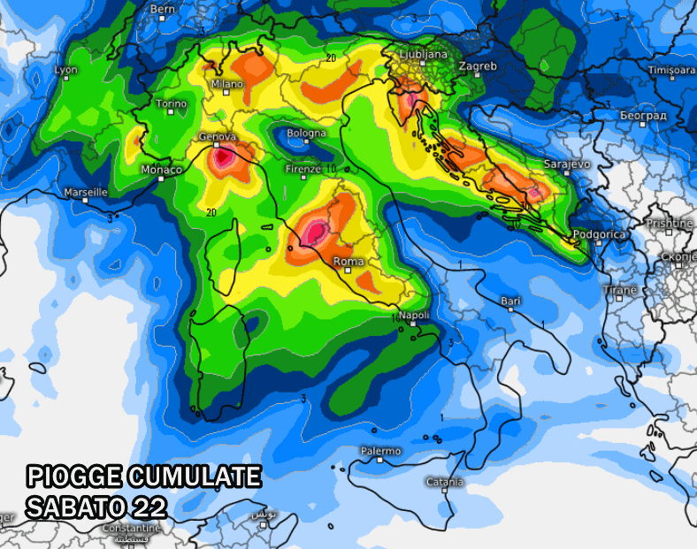 Nel corso di sabato, il maltempo si estenderà a tutto il resto del Nord e a tutte le regioni centrali, con accumuli più consistenti nei versanti più esposti, come in Toscana, Lazio e Triveneto.