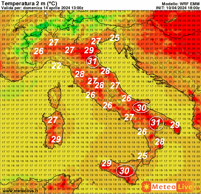 Termometro a 31° su Emilia Romagna e Lucania; 30° in Sicilia ed in Puglia; 28-29° diffusi da nord a sud, a testimoniare una giornata estiva a tutti gli effetti. Nel pomeriggio-sera di domenica sono attesi rovesci sulle Alpi ad anticipare il cambiamento che avverrà durante la prossima settimana.
