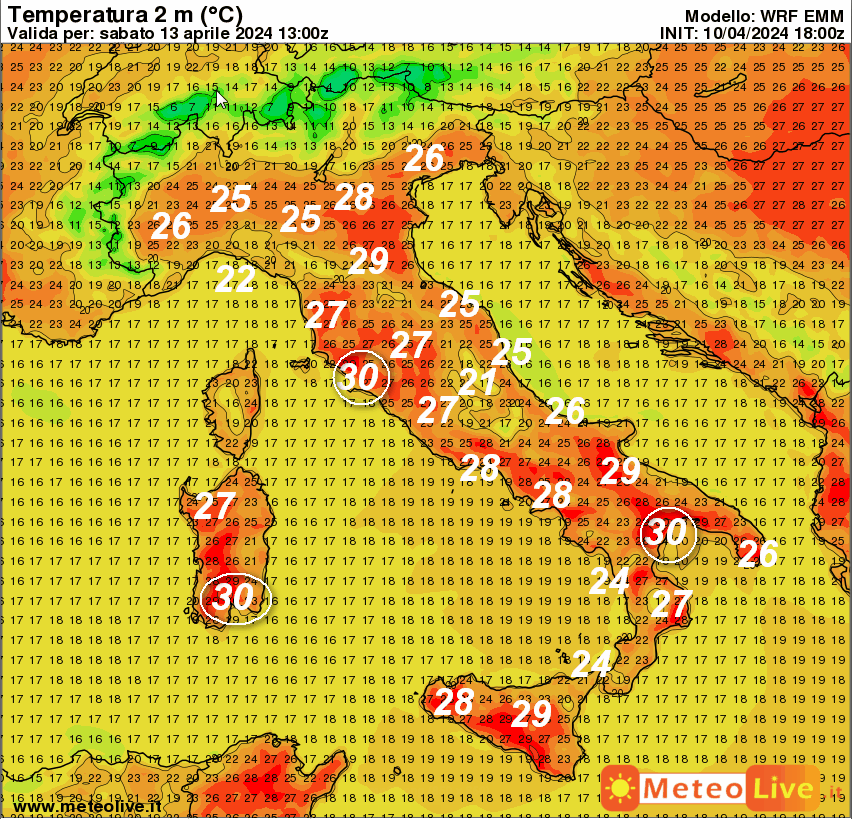 I 30° si toccheranno sulla Sardegna, la Lucania e la bassa Toscana, ma temperature attorno a 26-28° saranno presenti in maniera diffusa da nord a sud, ad eccezione solo di alcune aree costiere per via del mare freddo.