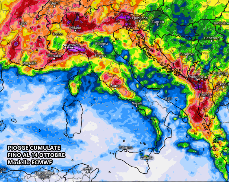 Ancor più incisive le piogge secondo il modello europeo ECMWF. In Liguria si intravedono accumuli totali, nei prossimi 10 giorni, superiori ai 300 mm! Fino a 200-250 mm in Lombardia e Friuli (a ridosso dei monti). Fino a 60-80 mm sul medio Tirreno, mentre il sud vedrà ben poco, eccetto la Campania.