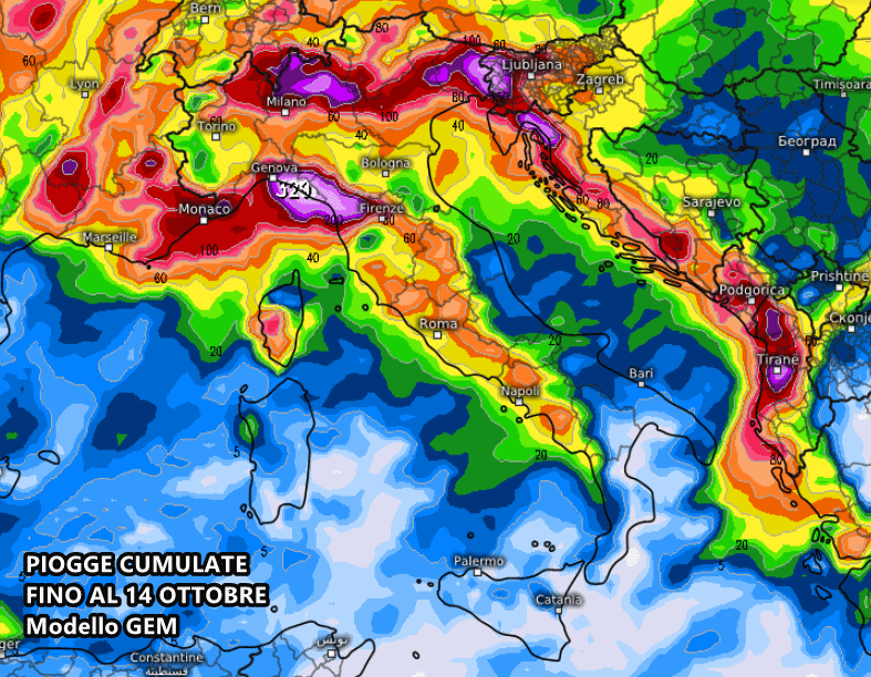 Nei prossimi 10 giorni, le precipitazioni totali previste dal modello canadese GEM sono ragguardevoli per il nord Italia. Sulla Liguria centrale, l’alta Lombardia ed il Friuli si ipotizzano picchi totali superiori ai 200 mm. Gran parte del sud e le isole maggiori, invece vedranno accumuli di gran lunga inferiori o addirittura assenti: