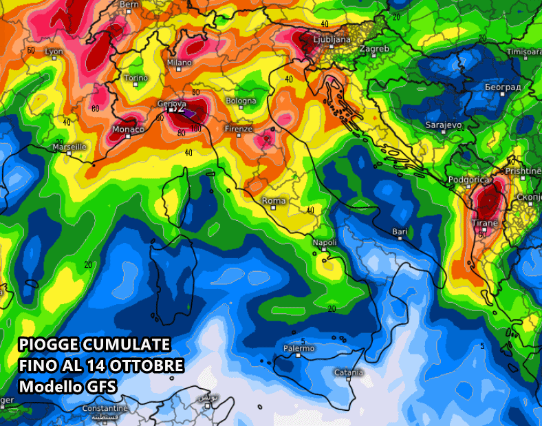 Molto simile sulla diffusione del maltempo il modello americano GFS, ma con accumuli meno corposi al nord.