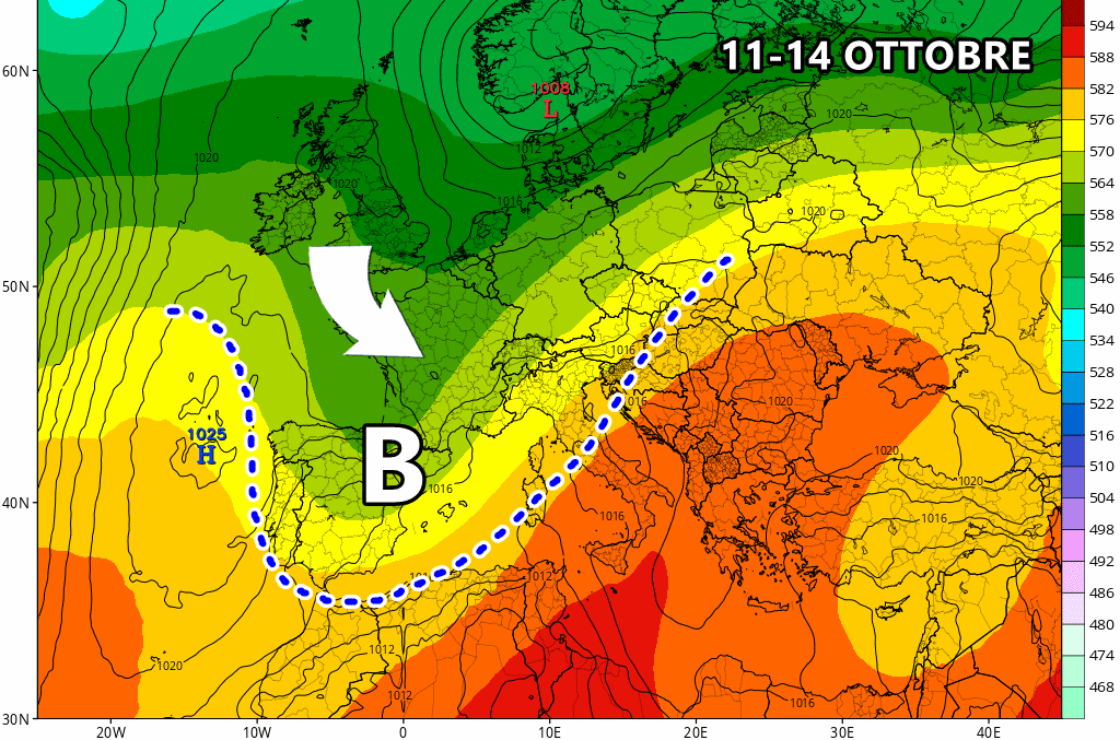 Ancor più ficcante e incisiva potrebbe essere la terza perturbazione del mese, ipotizzata tra 11 e 14 Ottobre: è chiaro che mancherebbero parecchi giorni a questa data, ma le dinamiche in essere sono abbastanza probabili. Una saccatura fresca nord-atlantica potrebbe raggiungere la penisola iberica ed il Mediterraneo occidentale, innescando la risalita di aria calda e molto umida verso l’Italia. In questa circostanza potrebbe svilupparsi una forte ondata di maltempo persistente sul nord Italia e l’alto Tirreno, mentre il sud potrebbe improvvisamente ritrovarsi sotto il caldo africano per un paio di giorni!