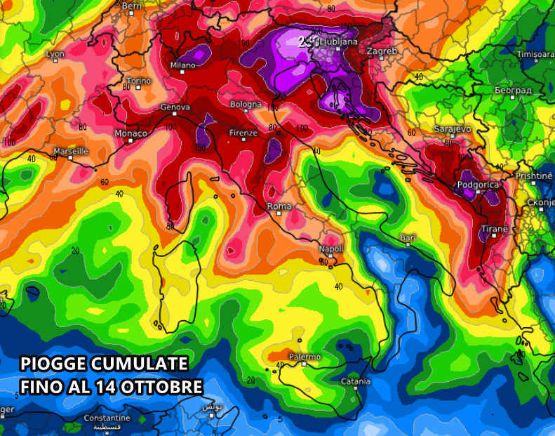 La sommatoria di tutte queste perturbazioni è visibile nella mappa di seguito, che mostra gli accumuli pluviometrici totali fino al 14 Ottobre. Il nord Italia e l’alto Tirreno saranno senz’altro gli obiettivi principali del maltempo: in Friuli Venezia Giulia si prevedono accumuli totali superiori ai 250 mm nei prossimi 12 giorni!