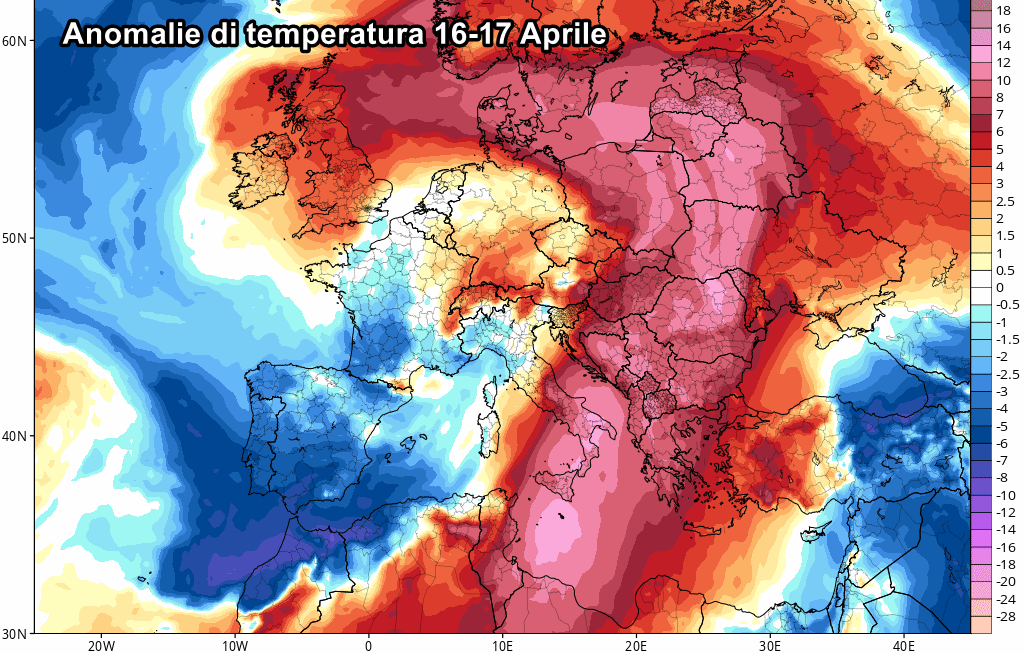 Le anomalie previste tra il 16 e il 17 aprile sono davvero ragguardevoli, non solo su tutto il Sud Italia, ma su gran parte d’Europa, come possiamo notare dal colore rosso imperante su buona parte del vecchio continente.