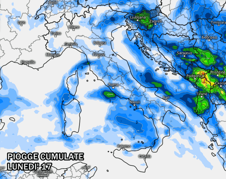Trattandosi di una perturbazione molto marginale, il cui vero obiettivo sarà l’Est Europa, è chiaro che ci troveremo a che fare con fenomeni abbastanza irregolari e di breve durata. Nella giornata di lunedì 17 marzo, ci aspettiamo il transito del fronte freddo della perturbazione, che potrebbe arrecare instabilità disorganizzata, soprattutto tra il pomeriggio e la sera, lungo le regioni adriatiche. Probabili locali acquazzoni, qualche isolato temporale e anche qualche gradinata, mentre la quota neve scenderà fino ai 1200 metri di altitudine in Appennino.