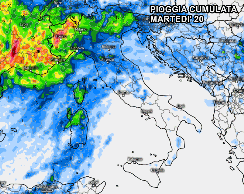 Eloquenti le piogge previste nel corso di martedì 20 maggio, con fenomeni più concentrati sul Nord-Ovest, specie a ridosso dei monti. Gli accumuli pluviometrici potrebbero variare tra i 20 e i 60 mm su gran parte del Nord-Ovest, e inoltre non si escludono improvvisi forti temporali, con grandinate e raffiche di vento sostenute.