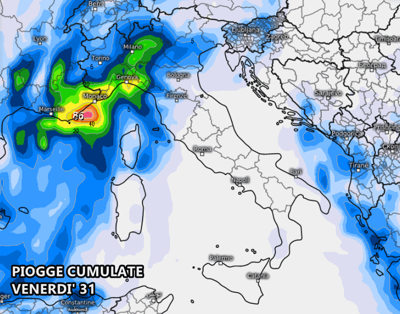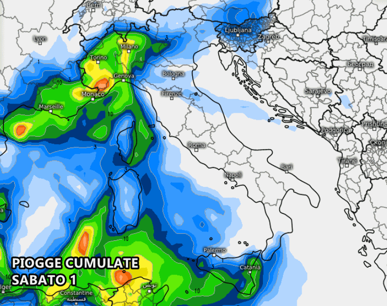 Negli ultimi aggiornamenti meteo, è stato senz’altro aumentato il carico di piogge previste sulle regioni settentrionali. I flussi umidi, provenienti da Sud, garantiranno precipitazioni su Liguria, Piemonte, Valle d’Aosta, Lombardia e, a quanto pare, anche su Emilia-Romagna, Veneto e Trentino-Alto Adige. Le piogge più consistenti riguarderanno i settori più occidentali, come Liguria e Piemonte, dove si prevedono picchi pluviometrici superiori ai 50-60 mm tra venerdì e sabato.