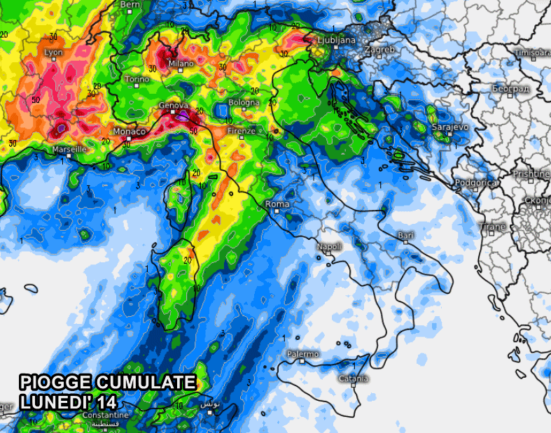Nella giornata di lunedì 14 aprile, il maltempo sarà ancora più insistente sulle regioni del Nord e potrebbe estendersi anche alle regioni centrali, lasciando a secco il Sud. Si prevedono accumuli di pioggia piuttosto ragguardevoli, soprattutto al nord-ovest e in Liguria, alto Piemonte e alta Lombardia, con picchi di oltre 80 o 90 mm.