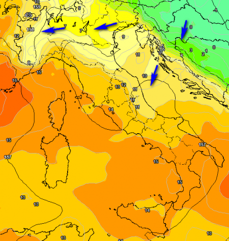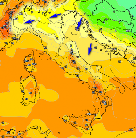 Nel frattempo la regione balcanica verrà raggiunta da aria nettamente più fredda, che finirà per intrufolarsi parzialmente anche sul catino padano dalla notte su lunedì sottoforma di venti orientali anche sostenuti, che spingeranno anche dell’aria umida sul Piemonte e l’ovest Lombardia, che si presenterà con delle nubi basse mattutine.