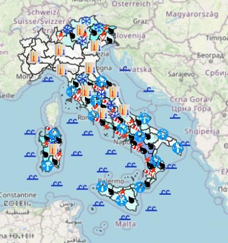 Nevicate: al di sopra dei 600-800 m sui settori alpini centro-orientali, con apporti al suolo da deboli a moderati, specie sui settori orientali del Friuli Venezia Giulia; al di sopra dei 900-1100 m sull’Appennino settentrionale, con apporti al suolo deboli; inizialmente al di sopra dei 1000-1200 m, in calo fino ai 700-900 m su Appennino centrale e rilievi della Sardegna, con apporti al suolo da deboli a puntualmente moderati.
