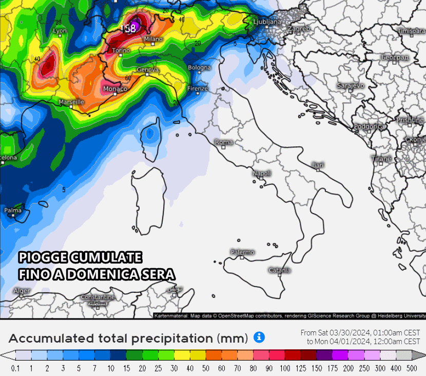 Il clima sarà meno caldo ma comunque ancora mite sul Nord Italia, dove a breve giungeranno una maggiore nuvolosità e anche occasioni di maltempo. Eloquenti le precipitazioni previste nelle prossime 36 ore (fra sabato e la domenica di Pasqua), quasi interamente concentrate sul Nord Italia, mentre il resto della penisola non vedrà quasi alcuna precipitazione nel corso di questo fine settimana.