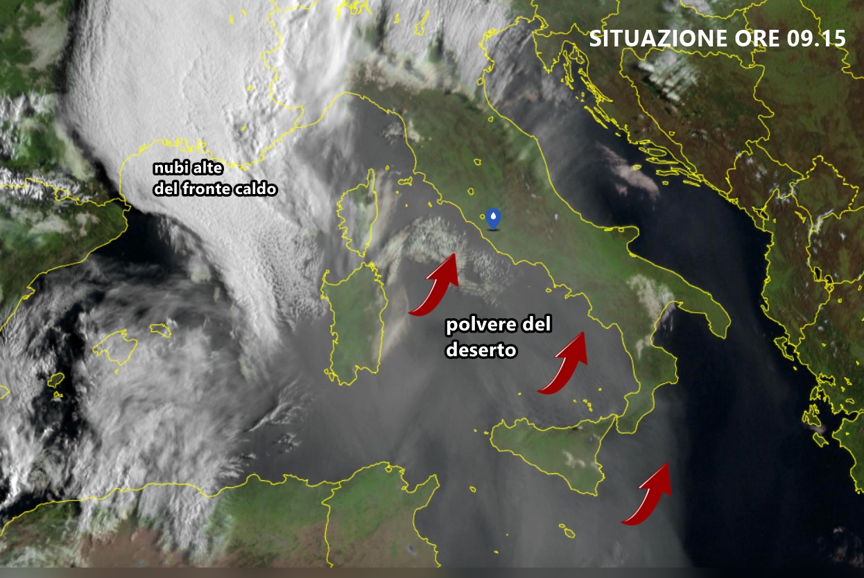 La nuova perturbazione, ampiamente annunciata nei giorni scorsi, si sta dirigendo verso il Mediterraneo ed è già all’opera, causando i suoi primi evidenti effetti sulla nostra penisola. Da diverse ore, gran parte del Sud Italia è alle prese con un forte vento di scirocco, con raffiche anche superiori ai 50 km/h, che tenderanno gradualmente ad intensificarsi col passare delle ore. Nel frattempo, sono arrivate vastissime nubi di sabbia provenienti dal deserto del Sahara, che al momento sono sospese in alta quota e stanno rendendo i nostri cieli decisamente sporchi e lattiginosi, soprattutto sul versante tirrenico.