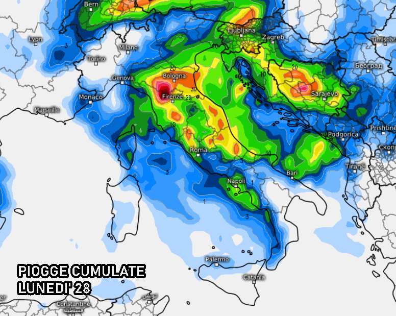 Si tratterà di una perturbazione proveniente dal centro Europa che scavalcherà il Nord e le Alpi Dinariche per poi puntare sul Centro-Sud con un fronte temporalesco piuttosto ampio e colmo di precipitazioni. Difatti, nella giornata di lunedì 28 luglio, si prevedono piogge diffuse e sostanziose su gran parte del Centro Italia e ancora un po’ di piogge anche per il Nord. In giornata, qualche fenomeno invaderà anche il Sud, ma sarà la giornata di martedì a poter osservare un peggioramento più diretto sulle regioni meridionali, con dei temporali anche piuttosto forti.