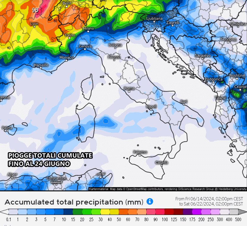 Dalle prime mappe delle precipitazioni totali cumulate nei prossimi giorni, possiamo osservare un maggior coinvolgimento dell’estremo Nord, soprattutto le aree pedemontane tra Piemonte e Lombardia. Più a sud, l’alta pressione subtropicale sarà molto più efficace e impedirà l’arrivo di particolari fenomeni.