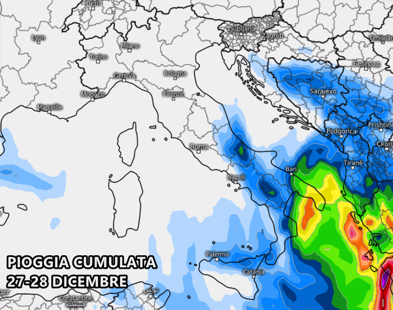 Secondo le indicazioni del modello americano GFS, il nucleo freddo proveniente dall’est raggiungerà Molise, Abruzzo, e Puglia tra il pomeriggio e la sera di venerdì 27 dicembre, causando piogge, rovesci, e nevicate a quote sempre più basse con l’arrivo dell’aria fredda dai Balcani. Entro la tarda sera, la quota neve potrebbe assestarsi attorno ai 400 metri di altitudine sull’Appennino centro-meridionale.