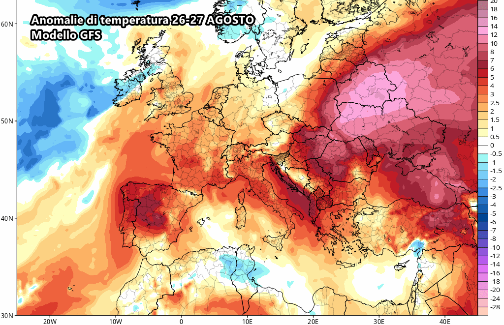 Questo rischio di temporali sarà palese tra lunedì 26 e martedì 27 agosto. Insomma, non si prevedono rinfrescate degne di nota, bensì solo l’arrivo di temporali sparsi, soprattutto al Nord e nelle zone interne del Centro-Sud. Questi temporali, approfittando della calura presente nei bassi strati, potrebbero dar luogo a forti acquazzoni e temporali intensi, come già visto in questo articolo.