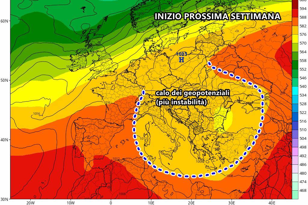 Dal punto di vista termico, secondo gli aggiornamenti serali dei principali centri di calcolo, non si prevedono particolari sbalzi di temperatura, bensì si prevede un incremento dell’instabilità. Cosa significa questo? Semplicemente che le temperature si manterranno su valori prettamente estivi, anche di qualche grado superiori alle tipiche medie del periodo, ma la presenza di aria instabile in alta quota favorirà lo sviluppo di rovesci e temporali da nord a sud.