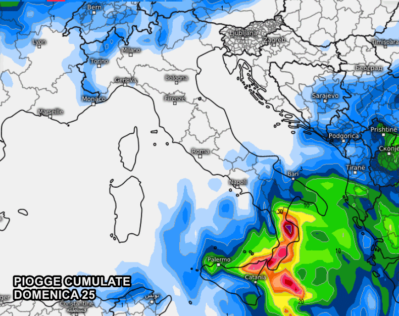 La perturbazione si organizzerà e rinforzerà ulteriormente nel corso di domenica, dando vita ad un ciclone nel mar Ionio. Attorno a questo ciclone continueranno a muoversi temporali e nubifragi, pronti a colpire il lato ionico del sud. Occhi puntati su Calabria e Sicilia orientale, dove spuntano picchi di pioggia superiori ai 100 mm a ridosso dei monti, nella sola giornata di domenica.