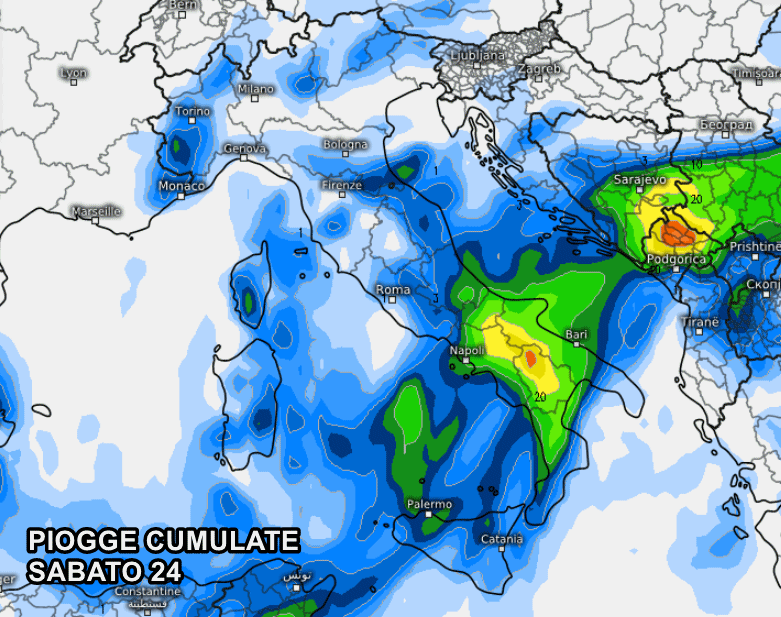 Secondo le ultimissime previsioni si ipotizza un passaggio temporalesco, nel corso di sabato, tra basso Lazio, basso Abruzzo, Molise, Puglia, Basilicata, Calabria e Sicilia. I temporali più forti potrebbero colpire Sicilia, Calabria settentrionale, Campania e Basilicata, ma la previsione è ancora ricca di insidie e incertezze.