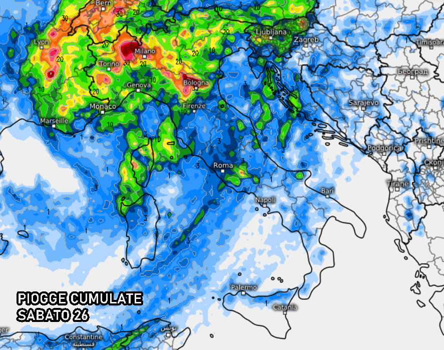Nel caso in cui dovesse davvero svilupparsi questa depressione sul Tirreno centro-settentrionale e il Mar Ligure, diventa assai probabile la formazione di una spirale nuvolosa colma di piogge e temporali non solo al Nord ma anche sulle regioni centrali. Non a caso, l’ultimo aggiornamento del modello europeo ci mostra precipitazioni diffuse nella giornata di sabato su gran parte del Nord e anche le regioni centrali, con rischio di isolati forti temporali. In tutto questo, il Sud Italia sarà ancora alle prese con il caldo africano e dovrà aspettare la giornata di domenica per una rinfrescata.