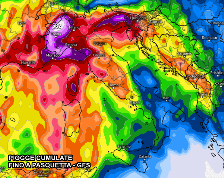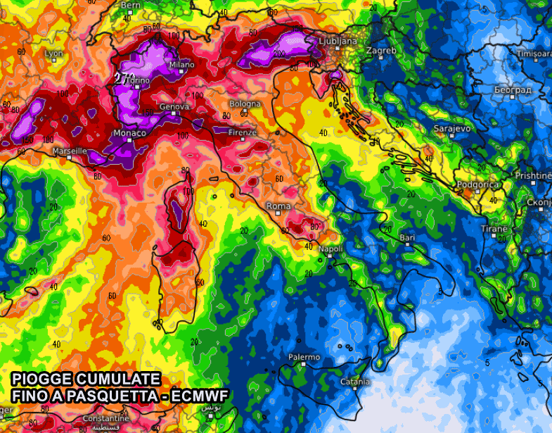 Eloquenti le piogge totali previste dal modello europeo ECMWF, da qui al giorno di Pasqua. In appena 7 giorni potrebbero precipitare oltre 200 o 250 mm su buona parte del Nord-Ovest, con picchi superiori ai 300 mm a ridosso dei Monti. Anche al centro Italia, soprattutto lungo il versante tirrenico, non si scherza: le precipitazioni risulteranno abbondanti per via di almeno tre perturbazioni che attraverseranno il Mediterraneo.