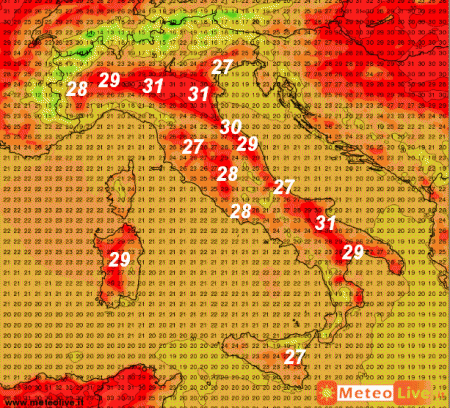 Punte di 31° sulla Pianura Padano-Veneta e sul Foggiano. Molti valori saranno comunque vicini ai 30°.