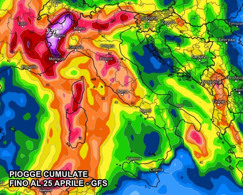 Nei prossimi 10 giorni, infatti, si prevedono picchi di oltre 300 o 350 mm sul Nord-Ovest, specie su alto Piemonte e alta Lombardia.