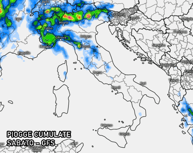 Il modello ci mostra la presenza di precipitazioni, derivanti da BREVI temporali di calore (tra sabato pomeriggio e sera), sui rilievi di Piemonte, Valle d’Aosta, alta Lombardia, Trentino alto Adige, alto Veneto, Friuli, zone interne della Liguria e Appennino tosco-emiliano. Trattandosi di temporali di calore, è chiaro che parliamo di fenomeni isolati e di breve durata, ma potenzialmente di forte entità. Dunque sarà necessario prestare attenzione alle potenziali condizioni meteo avverse (come grandine, colpi di vento e nubifragi).