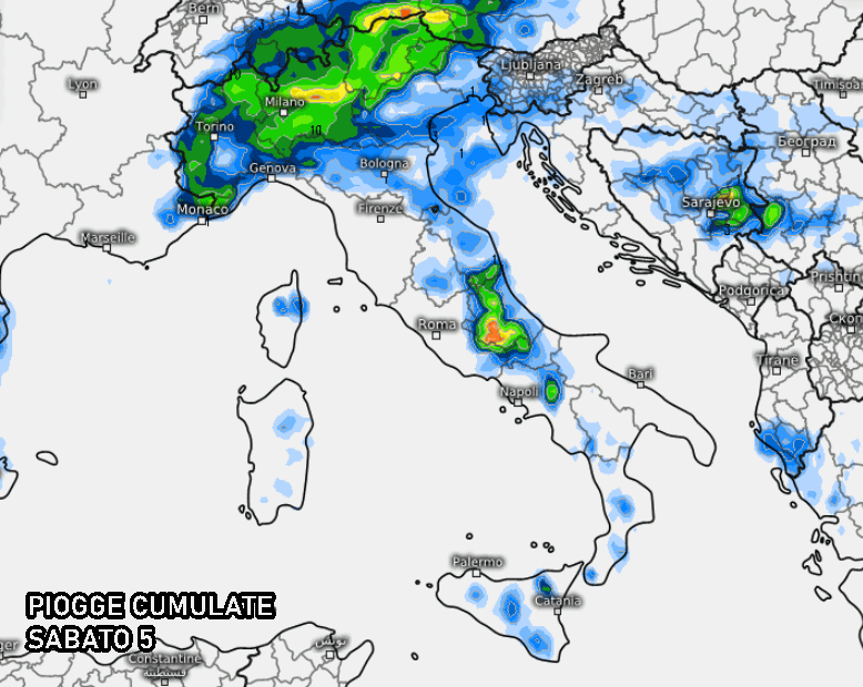 Nel corso della giornata di sabato si prevede la formazione di tanti temporali isolati ma potenzialmente molto forti, poiché trarranno tantissima energia dal cuscinetto di aria calda e umida situato sulla Val Padana e nelle aree interne del centro. Avremo temporali sia nelle ore notturne di sabato sia durante il tardo pomeriggio e la sera: chiaramente notiamo fenomeni più concentrati al Nord, non solo su Alpi, ma anche in Val Padana, mentre qualche forte isolato temporale potrebbe colpire anche le zone interne del centro, specie tra Marche, Abruzzo e Molise.