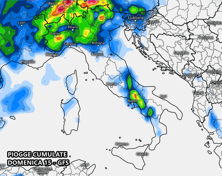 Il modello americano GFS calca ancor di più la mano, mostrando una frequente instabilità su gran parte del nord. Fenomeni intensi possibili su Piemonte, Trentino, Lombardia. Rischio temporali pomeridiani anche tra Abruzzo, Molise, Campania e Basilicata (prettamente in Appennino).