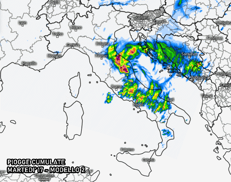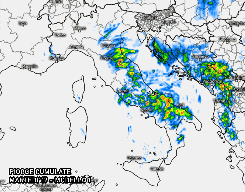 Qualche forte temporale potrebbe ancora interessare la Romagna, mentre il grosso delle precipitazioni interesserà Marche, Abruzzo, basso Lazio, Molise, Puglia centro-settentrionale e Appennino campano/lucano. Temporali assolutamente da non sottovalutare, poiché frutto di contrasti estremi tra aria fresca in quota e aria molto più calda e umida presente nei bassi strati. Si prevedono, indicativamente, accumuli di oltre 60-70 mm sulle Marche, fino a 30-40 mm altrove.