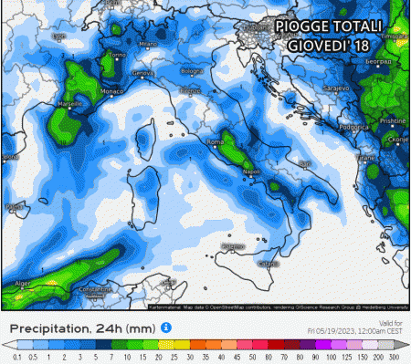 Di seguito la mappa degli accumuli di pioggia previsti nella giornata di giovedì. Possiamo notare, in verde, la presenza di accumuli modesti: questi saranno determinati da acquazzoni e temporali pomeridiani, specie su Piemonte, Lazio, Campania, Basilicata, Valle d’Aosta. Altrove tempo più stabile, con basso rischio di precipitazioni e sprazzi di Sole.